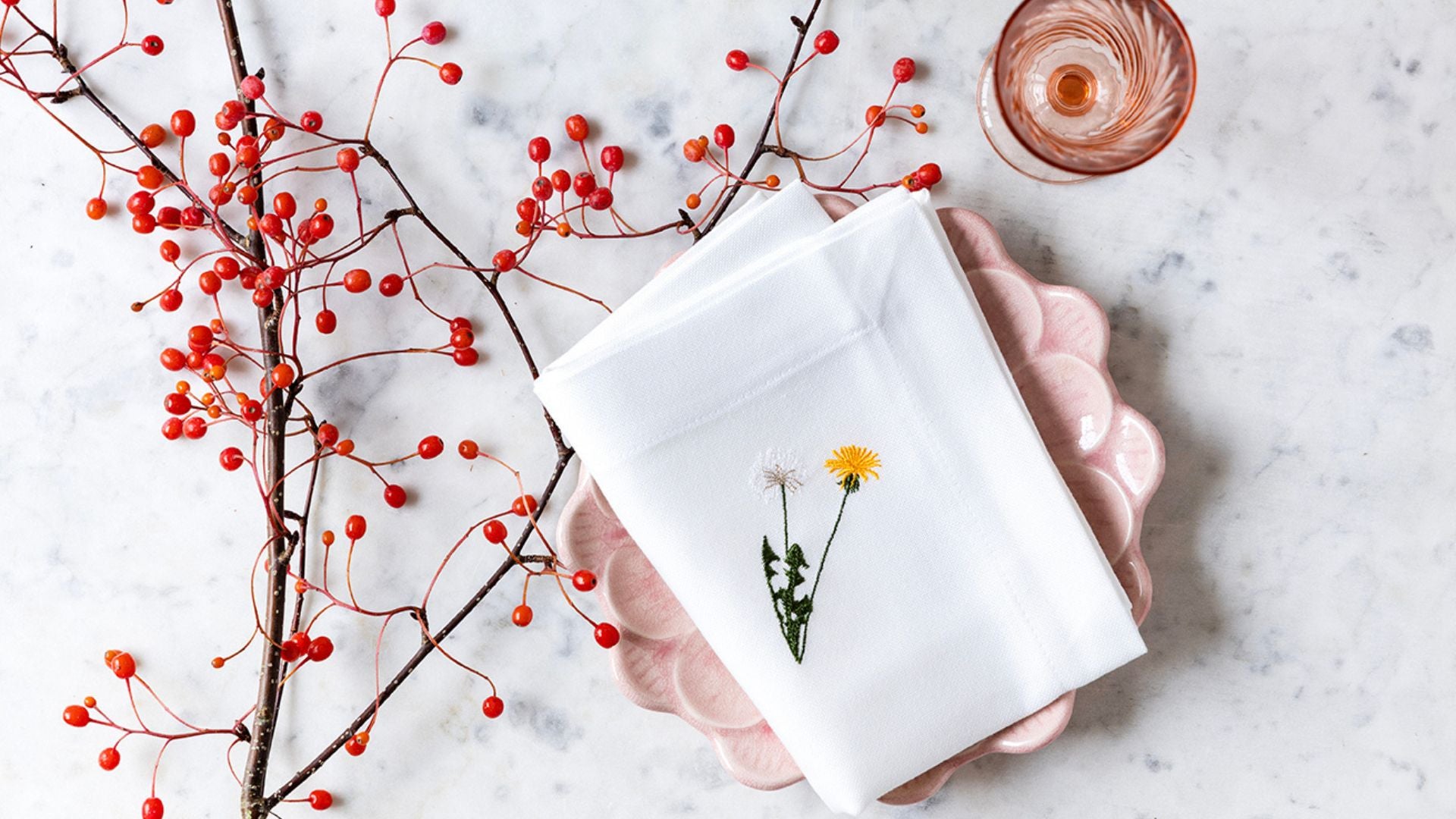 Med FLORA kommer der forår og sommer på bordet. Inspireret af Nordens vilde blomster - nogle vil kalde det for ukrudt, men vi synes disse blomster er så smukke, at de fortjener et smukt broderi. Brug servietterne og dugen til at dække det fineste poetiske sommerbord.
