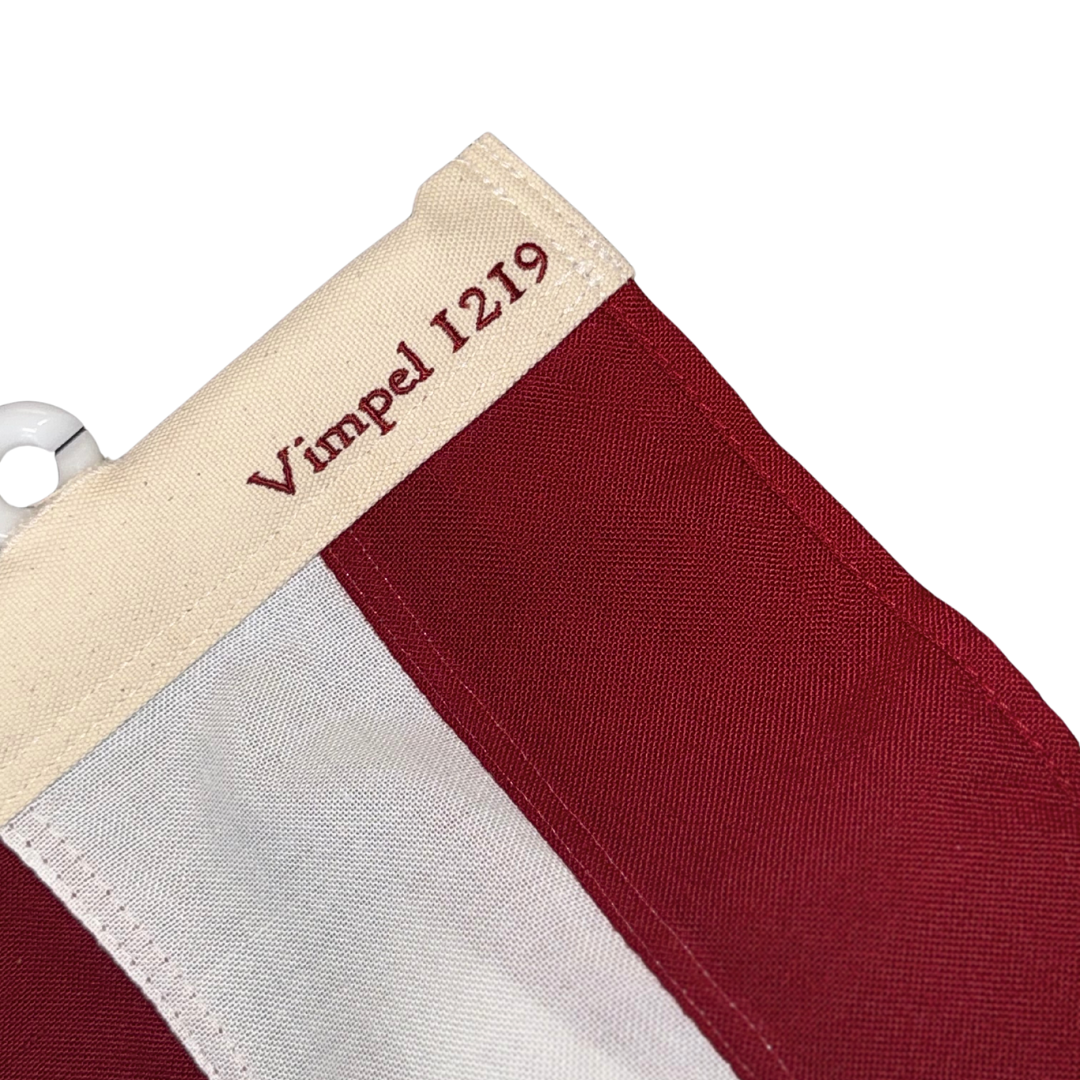 Vimpel 1219 er syet i en mørkere rød nuance, som ligger tæt op ad den kraprøde farve, der omtales i nogle af de tidligste beskrivelser af Dannebrog. Den dybere røde farve går igen i flere historiske gengivelser og har været en vigtig inspiration for os i udviklingen af vores jubilæumskollektion 1219 – lanceret i anledning af Dannebrogs 800-års jubilæum i 2019. Kollektionen begyndte med flaget, blev udvidet med standeren i 2023, og i 2026 introducerer vi den historiske vimpel.
