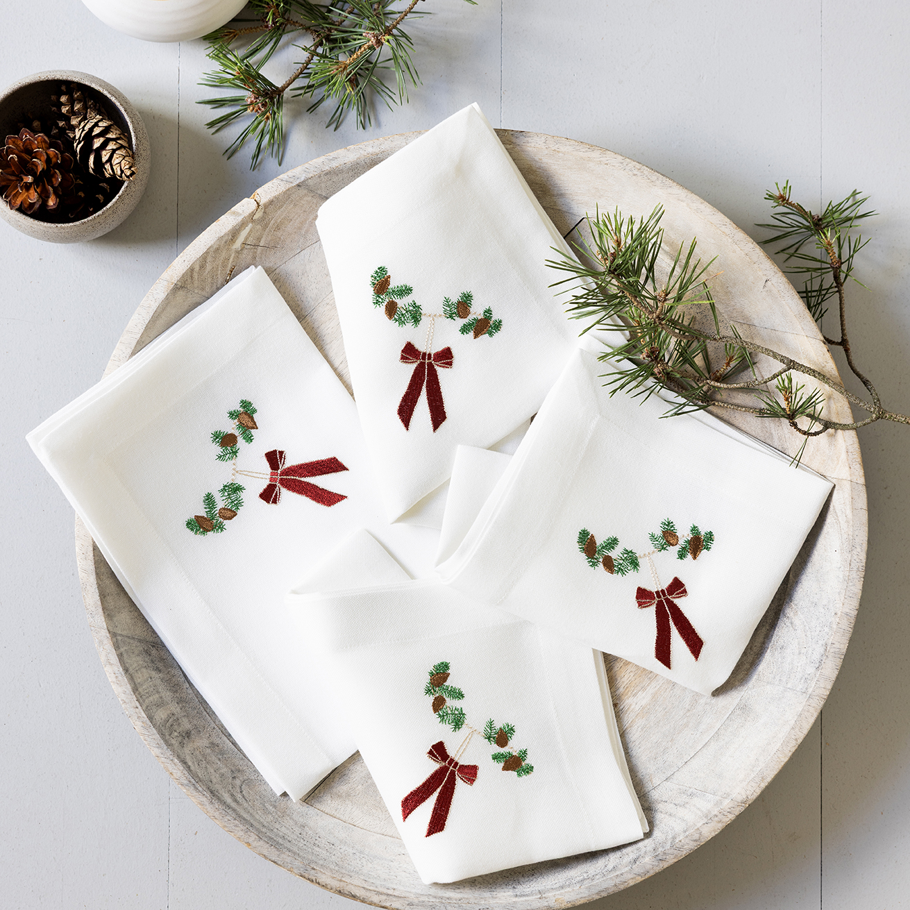 Hver serviet er fint og detaljeret broderet med en stor, mørkerød sløjfe – inspireret af traditionel engelsk julepynt, hvor sløjfen har været et elsket symbol i generationer.