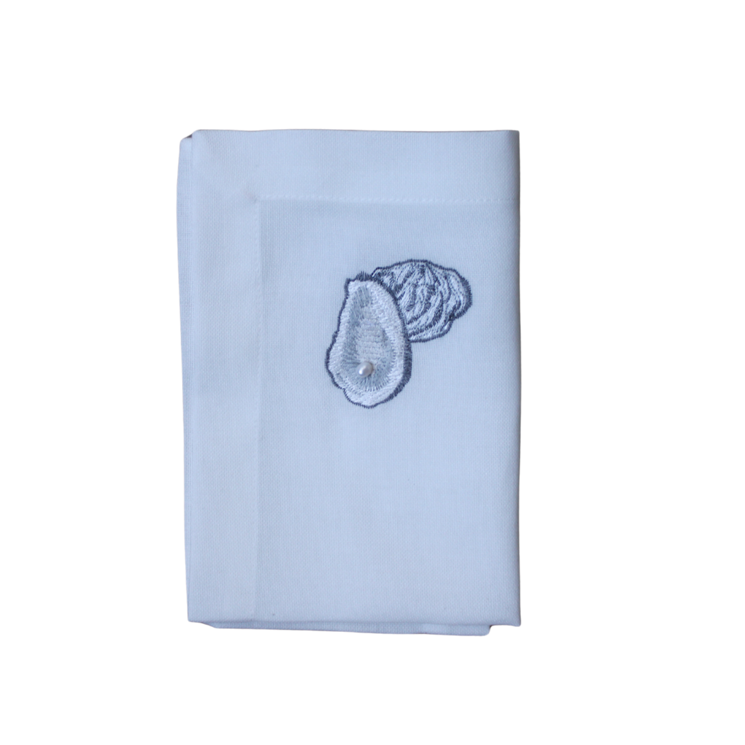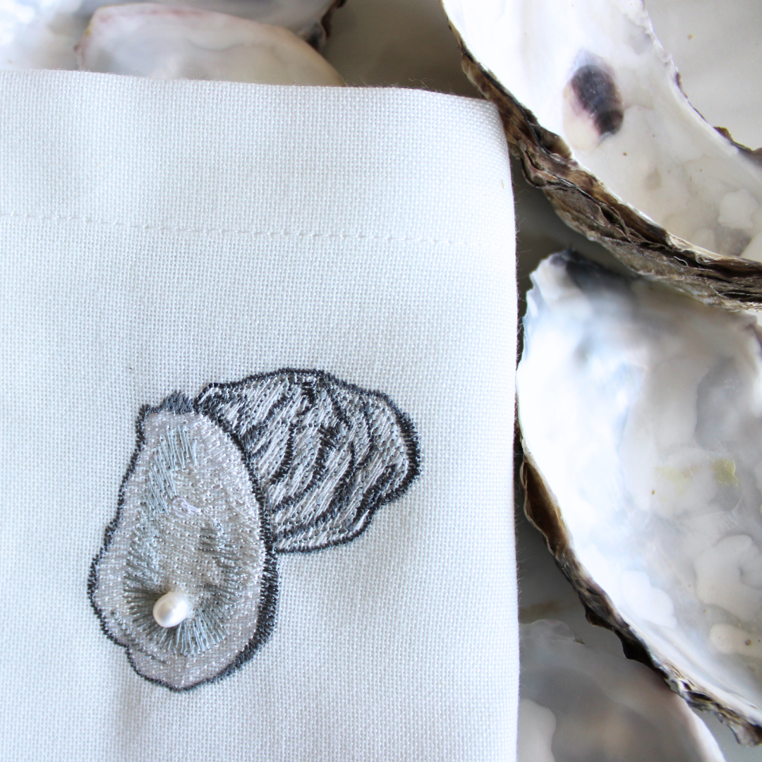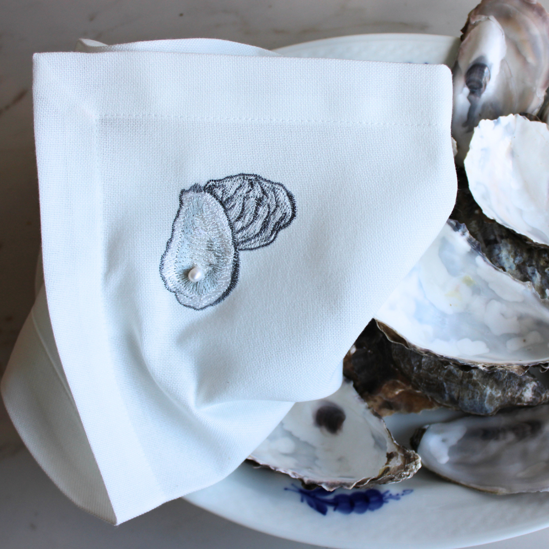 Materiale: 175g/m2 original flagdug med broderet østers i flere farver med påsyet perle