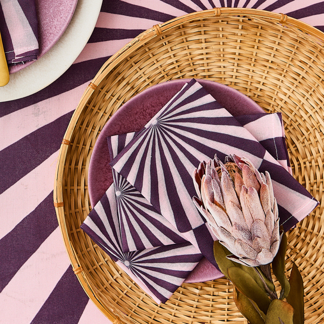 Cirkusservietterne i farvekombinationen blomme er landet – en fin blanding af rosa og mørk lilla. De bringer et strejf af cirkusmagi til bordet, og når du folder dem ud, får mønsteret næsten sit eget lille liv.